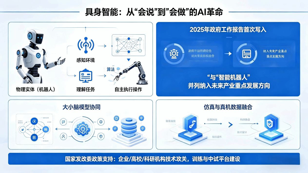 2025年,“具身智能”首次被写入政府工作报告,与“智能机器人”并列纳入未来产业重点发展方向,标志着这一前沿领域正式跃升为国家战略。国家发改委随后发布系列政策,明确提出支持企业、高校、科研机构围绕“大小脑”模型协同、仿真与真机数据融合等技术进行攻关,推动训练与中试平台等基础设施建设。